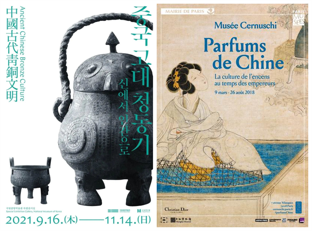 圖左為2021年9月,上海博物館在韓國國立中央博物館舉辦“中國古代青銅文明”特展海報(bào);圖右為2018年上海博物館在法國巴黎舉辦的“中國芳香:古代中國的香文化”展覽海報(bào) 圖片來源:上海博物館