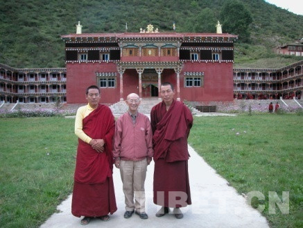 2004年9月3日,陳慶英先生在西藏自治區(qū)昌都市江達縣瓦拉寺調(diào)研,拍攝下大經(jīng)堂外廊21幅《格薩爾》壁畫。其后將他在寺內(nèi)外所拍全部珍貴照片贈送作者,希望作者好好研究。圖為陳老師與瓦拉寺僧人合影。