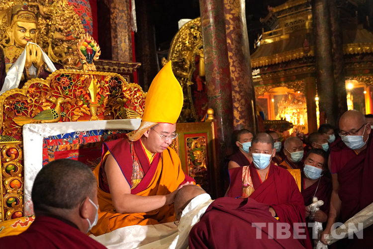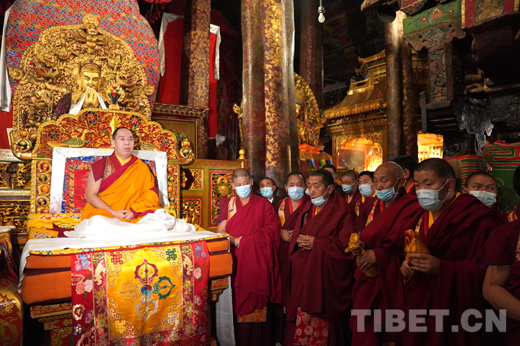 位于大殿東側(cè)正中的主殿,供奉有唐代文成公主帶入雪域高原的釋迦牟尼十二歲等身佛像。班禪入內(nèi),虔誠而莊重地向佛像叩頭朝拜、敬獻(xiàn)哈達(dá)。隨后登上法座,在領(lǐng)經(jīng)師的伴誦下帶領(lǐng)眾僧誦經(jīng),祈愿國泰民安、世界和平、風(fēng)調(diào)雨順、人類遠(yuǎn)離疫情、消災(zāi)祛難。集體誦經(jīng)結(jié)束后,班禪為大昭寺眾僧摸頂賜福并發(fā)放布施。