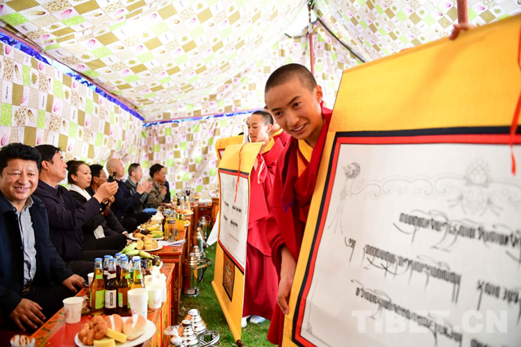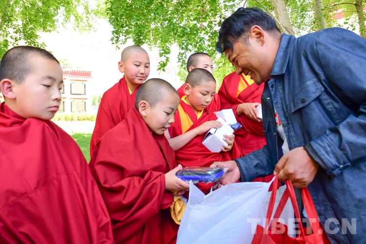 圖為佛學(xué)院老師代表相關(guān)單位向少年活佛贈送節(jié)日禮物 攝影:拉姆