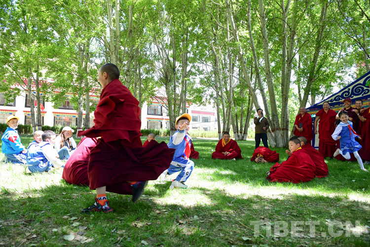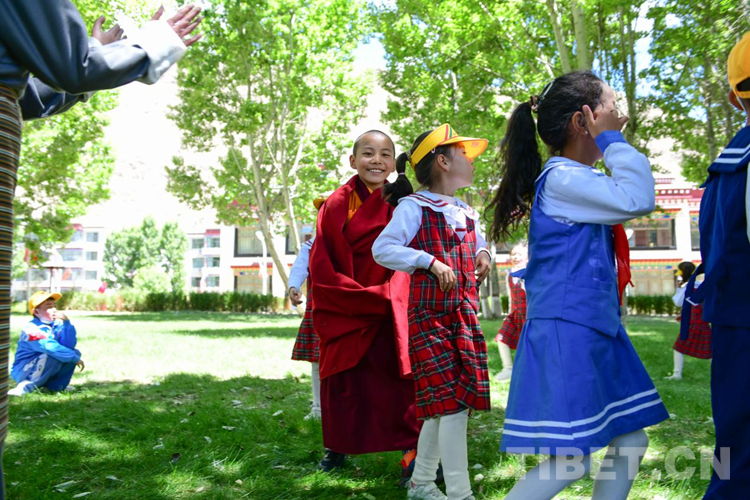 圖為少年活佛與拉薩市第一小學(xué)的學(xué)生一起做游戲 攝影:拉姆