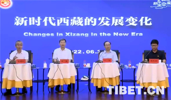 圖為6月22日,中國藏學(xué)研究中心二級(jí)研究員、學(xué)術(shù)委員會(huì)委員張?jiān)疲ㄗ蠖鐣?huì)經(jīng)濟(jì)研究所所長、研究員扎洛(左三),宗教研究所副所長、副研究員拉先加(右一)參加中國記協(xié)舉辦的“新時(shí)代西藏的發(fā)展變化”新聞茶座 截圖:劉莉