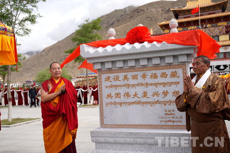 圖為班禪為西藏佛學院“建設美麗幸福西藏 共圓偉大復興夢想”石碑揭牌 攝影:王淑