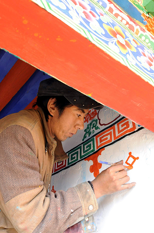 這是尼瑪縣文部鄉(xiāng)南村一戶人家請(qǐng)來(lái)畫師為自家安居新房進(jìn)行室內(nèi)彩繪(唐召明2009年攝)