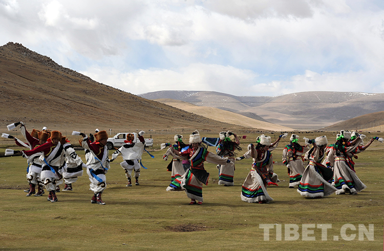 這是班戈縣諧欽民間藝術(shù)團(tuán)的年輕舞蹈演員,在家鄉(xiāng)的班戈草原跳起歡快的“鍋莊”(圓圈舞)(唐召明2015年5月21日攝)