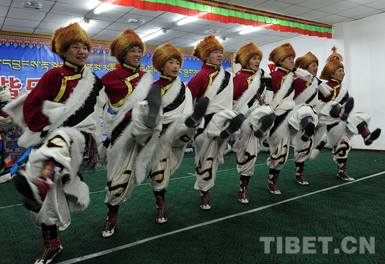 這是班戈縣諧欽民間藝術(shù)團(tuán)的年輕舞蹈演員,在北京華北電力大學(xué)禮堂進(jìn)行彩排時(shí)的劇照(唐召明2015年9月28日攝)