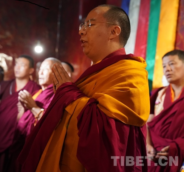 圖為班禪在羊堅(jiān)多康殿波米仁波切靈塔前誦經(jīng)祈禱 攝影:王淑