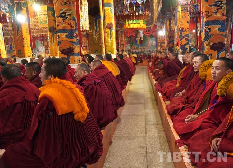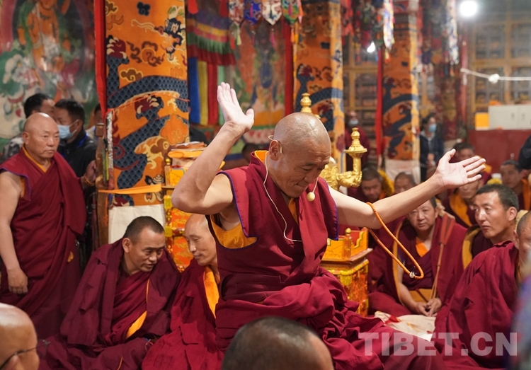 朝拜結(jié)束后,班禪步入甘丹寺夏孜扎倉,現(xiàn)場(chǎng)觀摩2023年度西藏自治區(qū)藏傳佛教學(xué)經(jīng)僧人晉升格西拉讓巴學(xué)位夏季預(yù)考活動(dòng)。