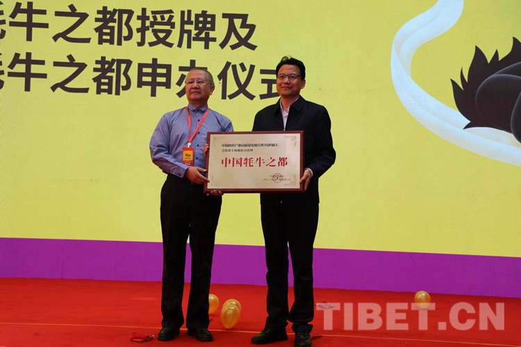 圖為7月20日在青海省玉樹藏族自治州開幕的首屆中國(玉樹)牦牛產(chǎn)業(yè)大會上,玉樹州獲得“中國牦牛之都”授牌 攝影:包利英