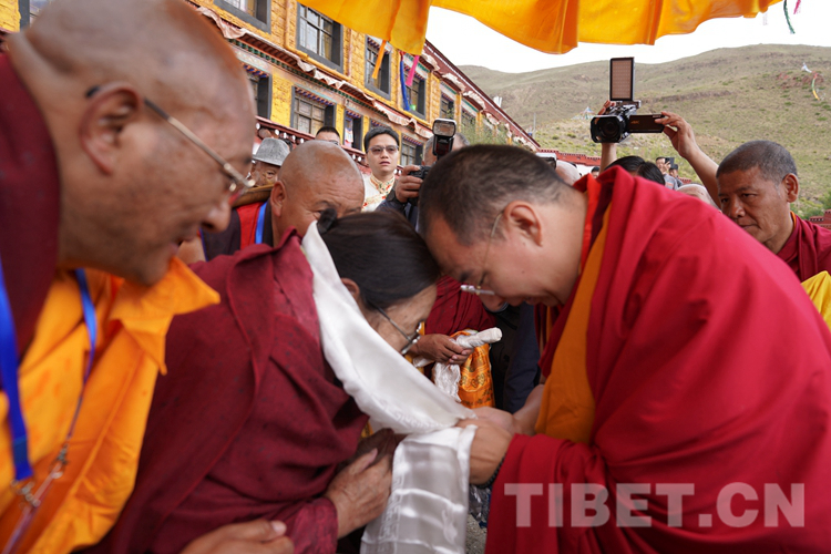 現(xiàn)年80歲高齡的桑頂?多吉帕姆德慶曲珍活佛在僧人的攙扶下前來(lái)迎接,班禪見(jiàn)到桑頂多吉帕姆活佛疾步向前,與桑頂多吉帕姆活佛互獻(xiàn)哈達(dá),行碰頭禮,互致問(wèn)候。