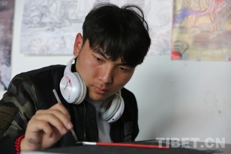 同期學(xué)員中,同樣來自唐卡世家的白瑪旺青,肩負(fù)家族厚望,被父親委派而來。2019年,白瑪旺青的父親學(xué)到半途,家中突然接到《格薩爾王與三十大將》的唐卡長卷訂單,不得不退學(xué)回到江達(dá)縣家中主持繪制工程。這次,他把兒子白瑪旺青、學(xué)徒桑培和尼瑪布派來學(xué)習(xí),自己帶著46個(gè)學(xué)徒繼續(xù)完成訂制唐卡的繪制?!案赣H對(duì)唐卡漆畫很支持,要求我們認(rèn)真學(xué),學(xué)成后再傳授給他本人和更多的學(xué)徒,”白瑪旺青說,“我和父親覺得,創(chuàng)作漆畫比傳統(tǒng)唐卡快,也會(huì)贏得新的市場,能帶動(dòng)更多學(xué)徒增收?!?/p>