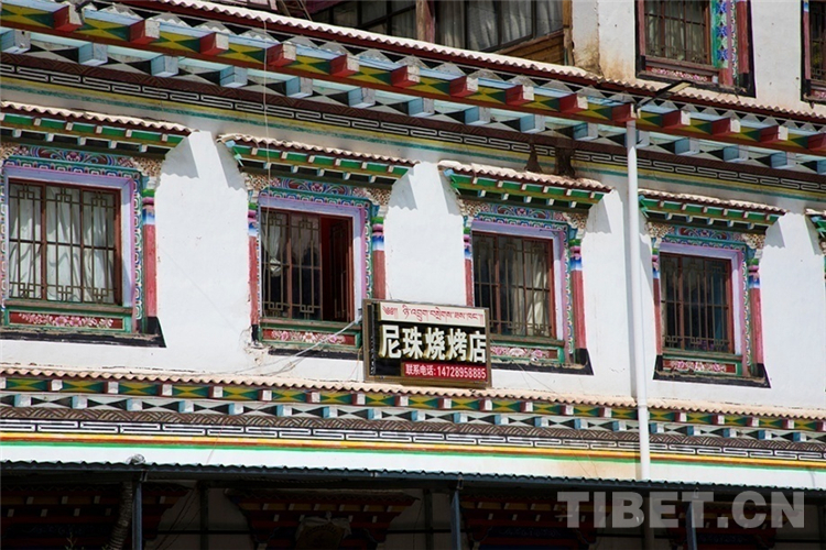 依山而建的藏式三層小樓里,丁增拉姆將房屋裝修得華麗亮堂,墻壁上繪有吉祥圖案,天花板與地板相接的立柱滿是精致的雕刻和彩繪,掛著吉祥的哈達(dá)。門外小院臺(tái)階旁的葡萄藤密密地纏繞在架子上,成串果實(shí)掛在枝頭。單獨(dú)分離出來的廚房和餐廳,也是孩子們的游樂場(chǎng),沐浴著陽(yáng)光下棋、讀書,一片歡聲笑語(yǔ)??拷鼧求w的小小花壇自然隔開了生活區(qū)和商業(yè)區(qū),一樓就是丁增拉姆家的尼珠燒烤店。沿著馬路的空地,搭建了長(zhǎng)長(zhǎng)的涼棚,夜晚在這里和三五好友吃著燒烤,吹著清涼的風(fēng),望著閃耀的星星,談?wù)勅松屠硐耄偈娣贿^了。