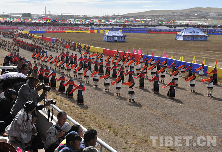 這是來(lái)自那曲地區(qū)(現(xiàn)那曲市)各縣代表隊(duì)在進(jìn)行入場(chǎng)式表演。當(dāng)日,那曲賽馬藝術(shù)節(jié)在藏北首府那曲鎮(zhèn)開幕(唐召明2013年8月10日攝)