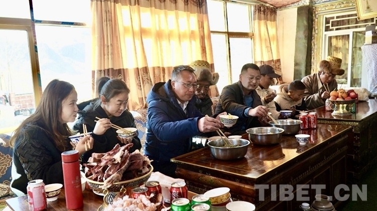 “這些干部和我們相處了這么長時間,都成自家人了。他們家在內地,但因為工作必須堅守崗位。我們能做的也不多,就是請他們到家中來吃個簡單的團圓飯。” 多章說著,老人的女兒央金熱情地端來酥油茶。