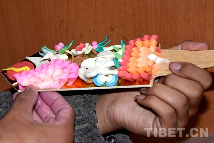 “酥油花手藝是我爸爸教給我的,然后我的弟弟、兒子的手藝是我教給他們的。去年年前一個(gè)月內(nèi),去掉其他開銷,我一個(gè)人賺了一萬多?!彪m然這活累了點(diǎn)兒,但在農(nóng)閑期間能有這樣一筆收入,對(duì)旦增家來說很可觀。