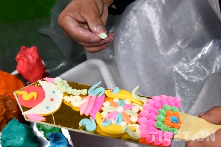 41歲的旦增熟練地捏取一小塊酥油在冷水中浸泡,隨后用食指和拇指將酥油捏成不同形狀,粘貼于一塊盾形木板上,色彩鮮艷的作品便完成了。旦增介紹,酥油花的制作原料是酥油,為了使其能夠凝固成型,酥油花必須在低溫環(huán)境下制作,防止體溫回暖影響酥油花成型,在捏制酥油花過程中,手也要不時(shí)浸泡在冰冷的水中降溫。