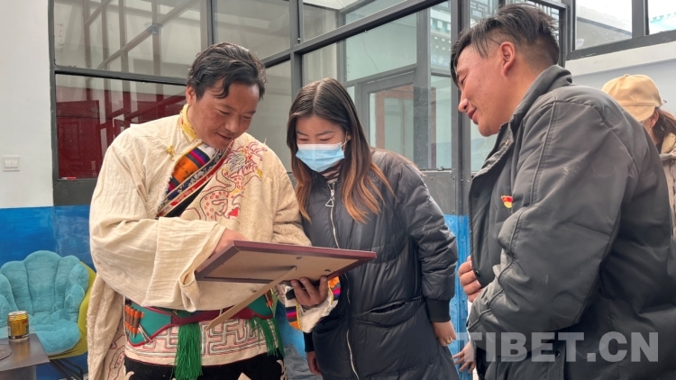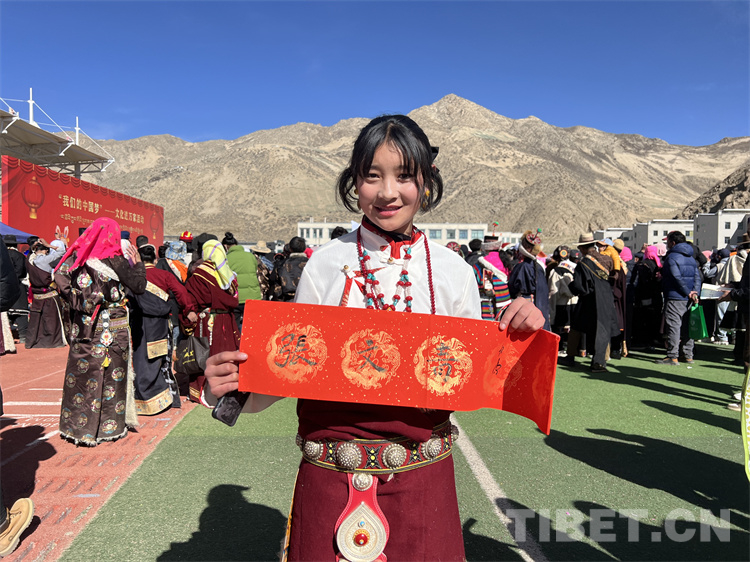 來到送“書法”現(xiàn)場,書法家們早早地來到活動現(xiàn)場,他們準備筆墨、鋪開紙張,為現(xiàn)場群眾書寫藏、漢文新年對聯(lián),“?!弊?、“吉祥如意”、“扎西德勒”等寓意美好的祝福。書法家協(xié)會副主席祖牛拉巴次仁說:“從春節(jié)開始,我們書法家們?nèi)W(xué)校、社區(qū)、搬遷安置點等地,書寫了超過1萬件的書法作品。這些作品深受大家的喜愛,我們后續(xù)也會繼續(xù)開展送‘書法’公益活動”?,F(xiàn)場群眾聚集在送“書法”現(xiàn)場,“西熱措姆”“張文青”“索朗旺青”“朗嘎達瓦”……孩子們爭先恐后請書法家把自己的名字寫在紅紙上?!斑@是我的名字,我爸是西寧人,我媽是那曲的,我們是從那曲安多縣搬遷過來的,我現(xiàn)在在森布日幸福中學(xué)上初三,將來要考那曲高級中學(xué)”張文青拿著書家贈給她的“名字”用流利的那曲話對記者說。