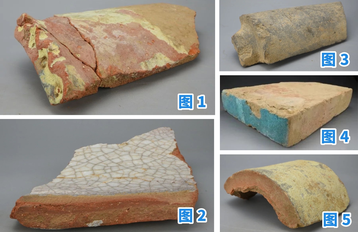 圖為西藏曲水溫江多遺址出土的各種建筑材料,圖1為綠釉紅陶花口板瓦殘塊、圖2為白釉紅陶板瓦殘塊、圖3為帶刻痕帶瓦舌灰陶筒瓦殘塊、圖4為藍釉琉璃磚、圖5為綠釉紅陶筒瓦殘塊 圖片來源:國家文物局供圖拼合