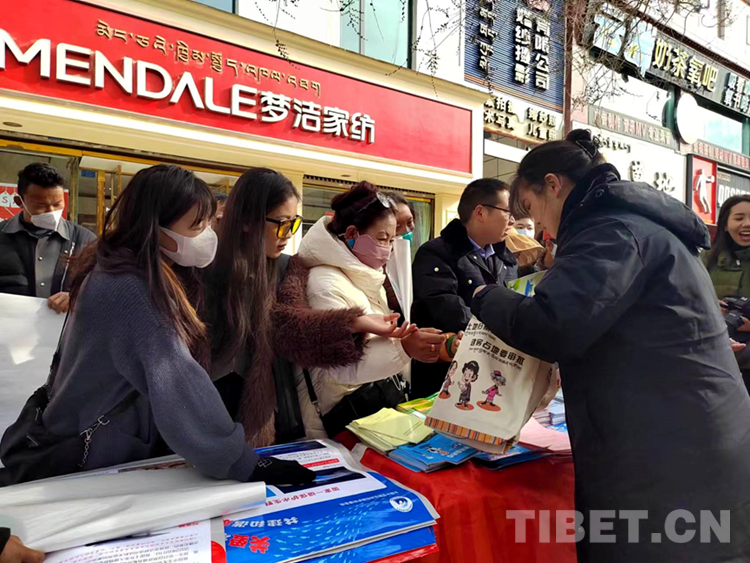圖為活動(dòng)現(xiàn)場(chǎng)工作人員向市民發(fā)放宣傳物品 攝影:次旦拉姆