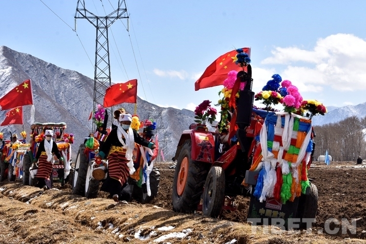 在雪水浸潤過的肥沃土地上,深耕機車輪翻滾而過,駛過的土地上翻起深色的泥土,婦女們跟在后面播撒青稞良種。