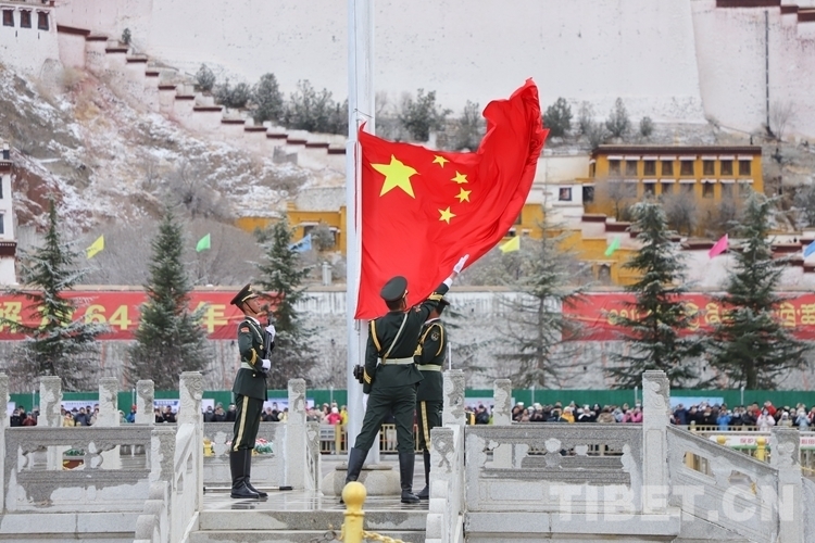 28日清晨,瑞雪洗禮拉薩,處處煥然一新,在干凈清新的氣息中,來自西藏各族各界的代表2000余人齊聚布達拉宮廣場,以升國旗、唱國歌的方式紀念百萬農奴解放64周年。
