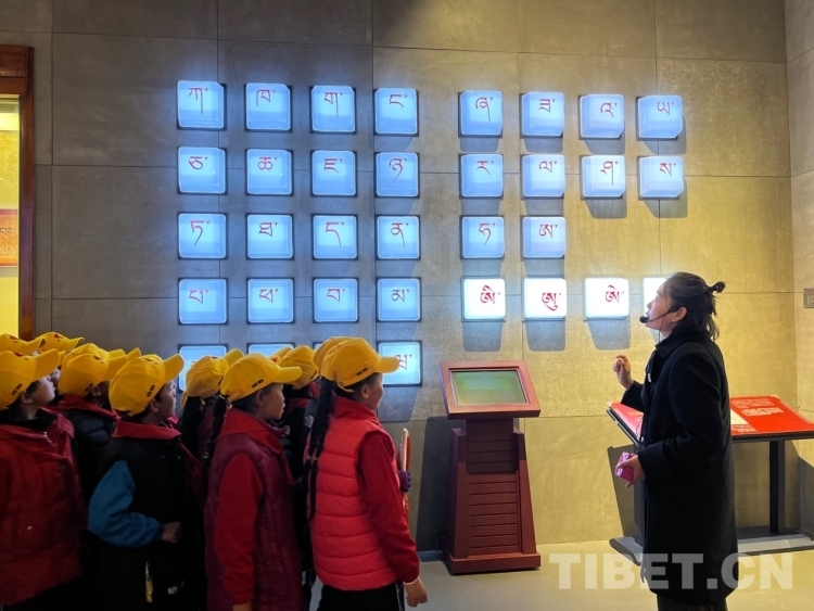 走進(jìn)“藏地智慧”,學(xué)生們一眼認(rèn)出藏文創(chuàng)始人吞彌·桑布扎,大家異口同聲回答講解員的問(wèn)題說(shuō):“這是吞彌·桑布扎?!钡玫街v解員的肯定、并向他們講述背后的相關(guān)歷史后,學(xué)生們聽(tīng)得很入迷,也更有信心面對(duì)接下來(lái)的問(wèn)題。藏文的信息化使得這一古老文字煥發(fā)著全新而旺盛的生命力,在這里學(xué)生們欣賞藏文在智能手機(jī)、電腦、多功能點(diǎn)讀機(jī)等智能電子設(shè)備內(nèi)“走動(dòng)”、傳統(tǒng)農(nóng)牧業(yè)的模擬場(chǎng)景和現(xiàn)代化的機(jī)械設(shè)備圖、藏醫(yī)藥材、藏香藏紙制造和制鹽過(guò)程等獨(dú)具特色的藏族傳統(tǒng)手工藝,也能很好的回答講解員提出的問(wèn)題,現(xiàn)場(chǎng)互動(dòng)氣氛熱烈?!斑@種活動(dòng)我們學(xué)校不會(huì)常有,當(dāng)孩子們聽(tīng)到要去拉薩時(shí)像是要過(guò)年那樣高興,一路上問(wèn)這問(wèn)那地充滿好奇。”多白鄉(xiāng)小學(xué)的帶隊(duì)老師羅珍介紹:“這次參加活動(dòng)的這些學(xué)生都是三、四、五年級(jí)的學(xué)生,個(gè)個(gè)品學(xué)兼優(yōu)。”