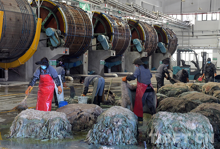 這是西藏地球第三極皮革產(chǎn)業(yè)有限公司浸水車間工人正在為羊皮進(jìn)行脫毛工作(唐召明2023年4月5日攝)