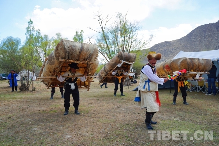 當(dāng)天恰好是周六,從拉薩來體驗(yàn)的游客不在少數(shù),有的是觀看了抖音直播就馬上騎車過來體驗(yàn)的。在營地,大家欣賞到了當(dāng)?shù)氐摹肮挝琛保ㄅFご瑁斡蛇叧吿摹鞍帷焙蜕肀撑Fご璧摹按颉焙献鞅硌??!鞍帷笔枪挝柚械念I(lǐng)舞者,跳牛皮船舞時(shí),“阿熱”手執(zhí)“塔塔”(五彩旗桿),唱著歌,跳著舞,另外4位舞者看著“阿熱”的動(dòng)作,背著重約80斤的牛皮船,用同樣的動(dòng)作跟著“阿熱”跳舞。大家動(dòng)作整齊,船漿擊打船舷的“咚咚”聲不絕于耳。