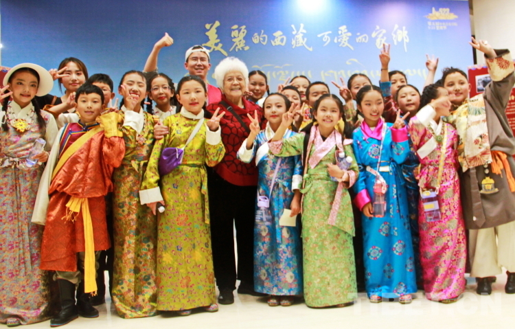 圖為《洗衣歌》編導、詞作者李俊?。ㄇ芭抛笪澹┡c西藏珠峰少年合唱團的小朋友們合影 攝影:劉莉