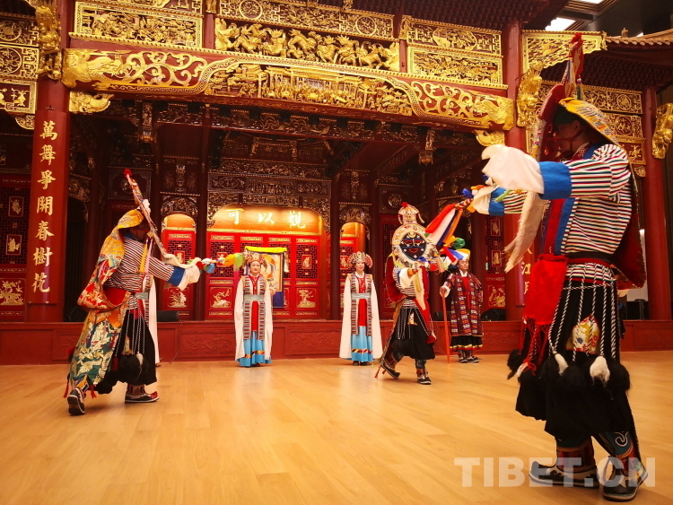圖為西藏自治區(qū)拉薩市城關(guān)區(qū)娘熱民間藝術(shù)團(tuán)的藝術(shù)家們?cè)凇皯蛭柩┯颉嘣幕曇爸械牟貞蛩囆g(shù)推廣研討會(huì)”上表演藏戲開場(chǎng)《溫巴頓》片段 攝影:劉莉
