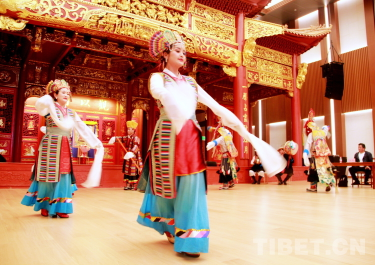 西藏藏劇團(tuán)副團(tuán)長(zhǎng)米瑪普赤就藏戲的起源、藏戲的特點(diǎn)、藏戲的流派等進(jìn)行了詳細(xì)介紹。伴隨著雄渾響亮的鼓鈸聲,西藏自治區(qū)拉薩市城關(guān)區(qū)娘熱民間藝術(shù)團(tuán)的藝術(shù)家們表演了藏戲開場(chǎng)《溫巴頓》、藏戲唱腔《朗薩雯波》之貢桑德慶唱腔、拉薩囊瑪《吉白尼瑪》、嘎爾《郎卓》等經(jīng)典片段。精美的服飾、鏗鏘的唱腔、緊湊的故事情節(jié)……贏得了與會(huì)嘉賓的連連贊嘆與陣陣掌聲。
