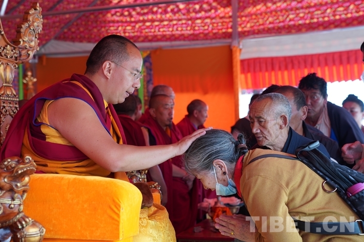 禮佛講經(jīng)儀式結(jié)束,班禪來到強巴林寺廣場內(nèi)的法帳中,為廣大信教群眾摸頂賜福。摸頂過程中,班禪不辭辛勞始終口誦經(jīng)文、面帶微笑,當(dāng)天共計為3.6萬名群眾摸頂,展現(xiàn)出愛國愛教、護國利民的良好風(fēng)范,贏得了僧俗信眾的廣泛贊譽。