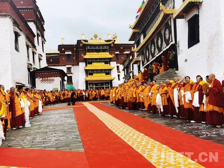 當(dāng)天清晨,強巴林寺桑煙氤氳,僧人儀仗隊早早在寺廟正門通往措欽大殿的通道兩側(cè)手捧哈達列隊等候,以藏傳佛教最高宗教儀軌迎接班禪。