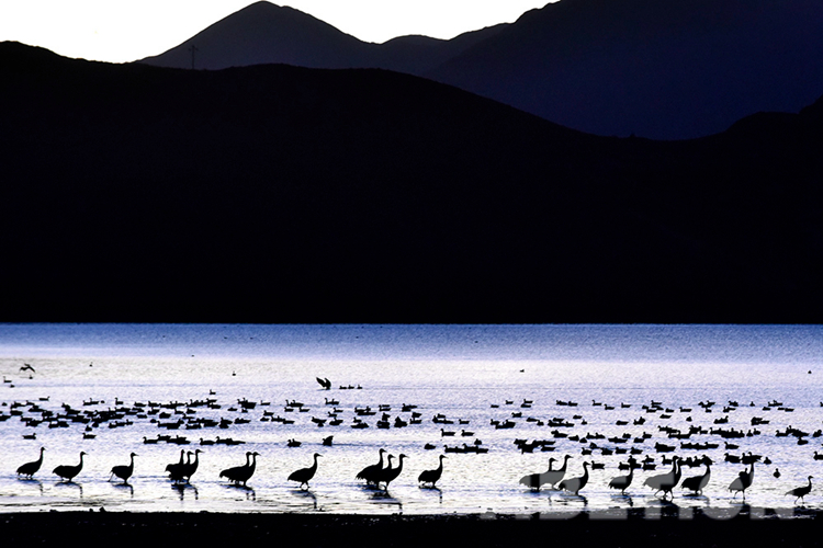 圖為晨光熹微,黑頸鶴在拉薩林周虎頭山水庫(kù)棲息 攝影:王媛媛