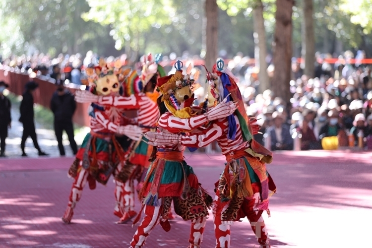 當(dāng)渾厚悠遠(yuǎn)的法號(hào)、法螺聲在大院內(nèi)外回旋開(kāi)來(lái),“羌姆”表演正式拉開(kāi)帷幕。期間,僧人頭戴面具,身穿戲裝,手持鼓刀斧等道具,逐次表演金剛、骷髏、鹿牛、比丘、鴉鴟、六長(zhǎng)壽等數(shù)十節(jié)神舞,氣氛莊重而神秘。
