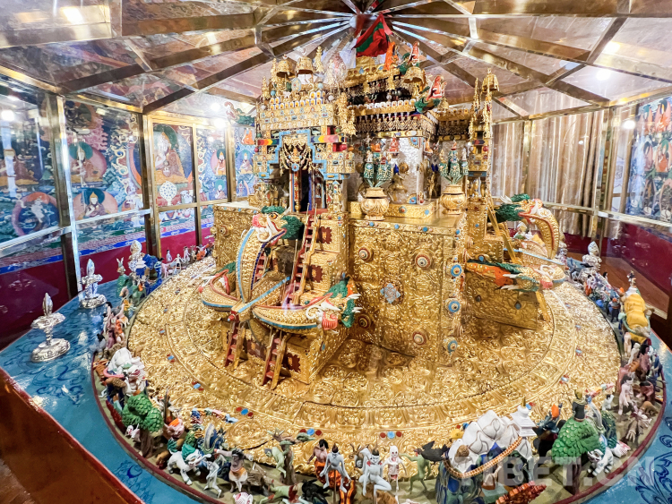 壇城,被稱(chēng)作“曼荼羅”,是藏傳佛教密宗的重要元素,承載了豐富的象征意義和深刻的修行內(nèi)涵,在藏傳佛教繪畫(huà)、寺院建筑、佛塔建筑、宗教法器、佛事活動(dòng)中被廣泛采用,并形成了固定的模式和種類(lèi)。 據(jù)扎什倫布寺僧人扎平介紹, “壇城從整體上來(lái)講有二維壇城、三維壇城之分,但按其造型形式,表現(xiàn)內(nèi)容和使用材料可分為平面繪畫(huà)壇城、立體建筑壇城、彩砂彩粉浮雕壇城等多種類(lèi)型。我們現(xiàn)在所看到的時(shí)輪壇城既是代表人體也是代表宇宙,它的每一個(gè)組成部分都與人體有著對(duì)應(yīng)關(guān)系。它是用金、銀、銅、木頭等制成的立體法器壇城模型,就像立體的宮殿,這類(lèi)壇城是作為密宗冥想法器,供陳列和膜拜使用。除此之外,還有金剛密法、喜經(jīng)剛兩座造型各異的壇城。殿堂頂部的壇城壁畫(huà)都是僧人以近乎于90度的立體筆觸繪制出來(lái)的,其難度可見(jiàn)一斑。”