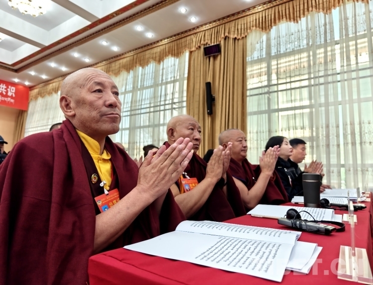圖為政協(xié)委員在認真審閱藏文版會議資料 攝影:次旦拉姆