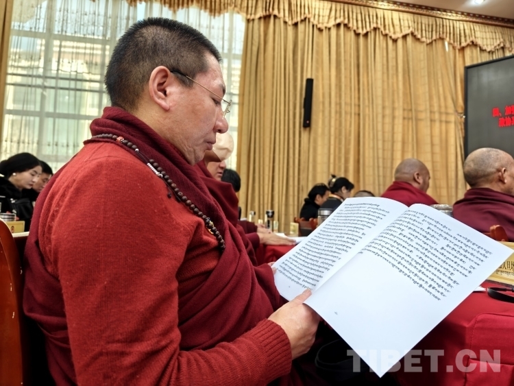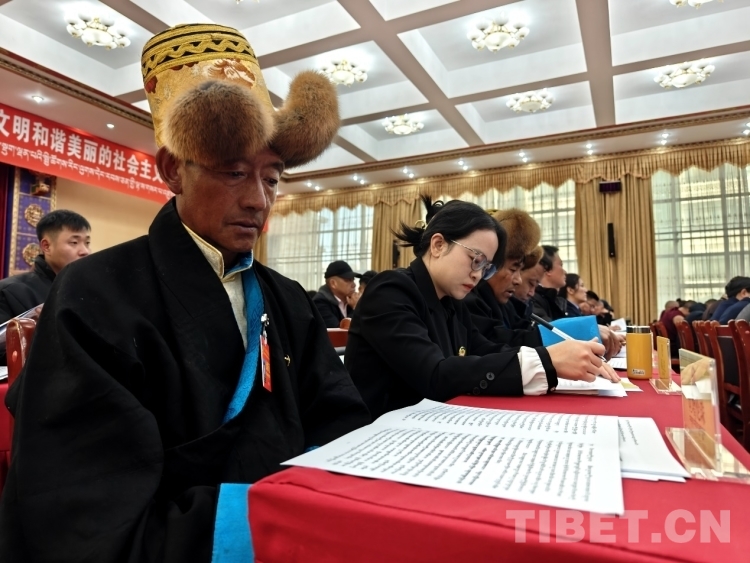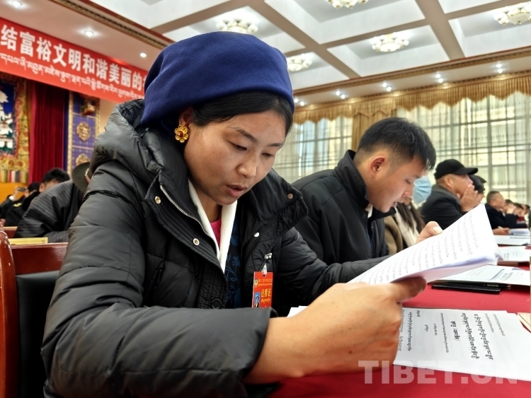 圖為政協(xié)委員認真審閱藏文版會議資料 攝影:次旦拉姆