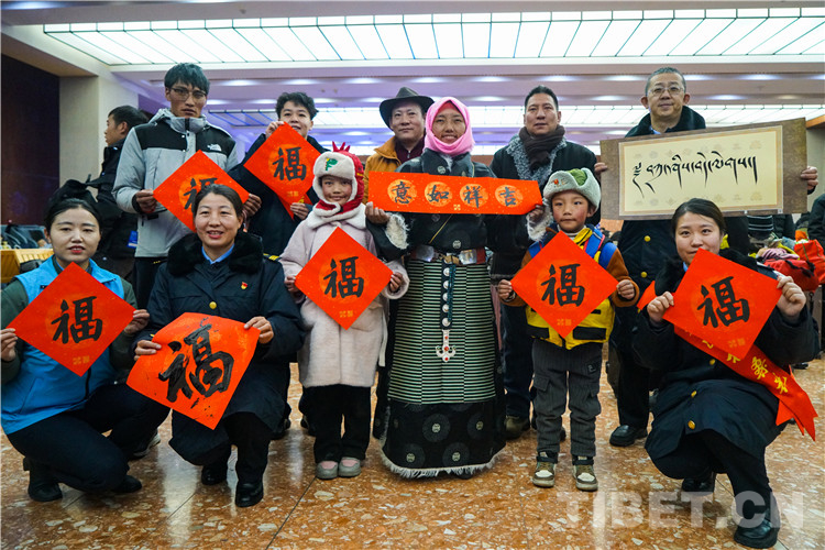 圖為春運(yùn)首日拉薩站向旅客免費(fèi)贈送漢藏春聯(lián)及書法作品 攝影:趙振宇