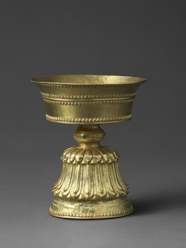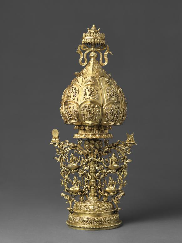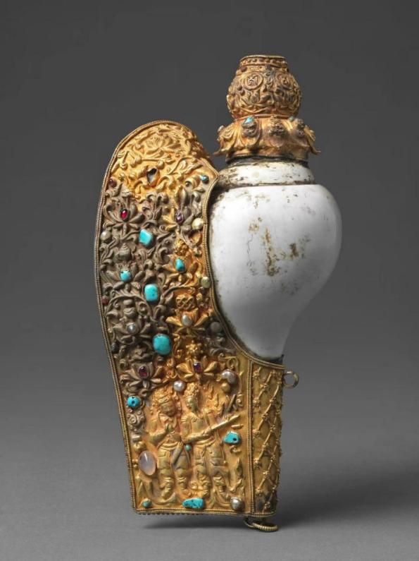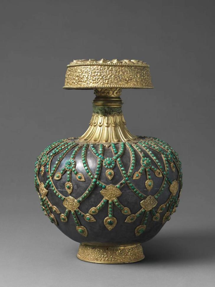 圖為公元18世紀銀質(zhì)嵌松石瓔珞紋尊勝瓶