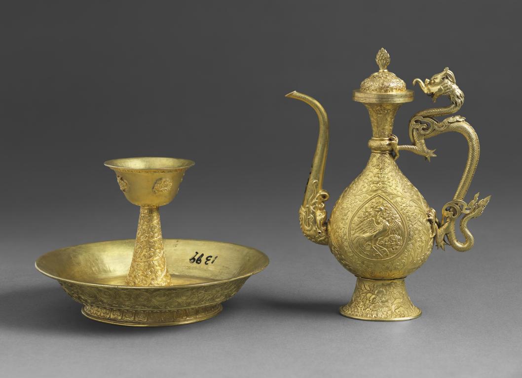 圖為公元18-19世紀龍柄執(zhí)壺及盤、杯