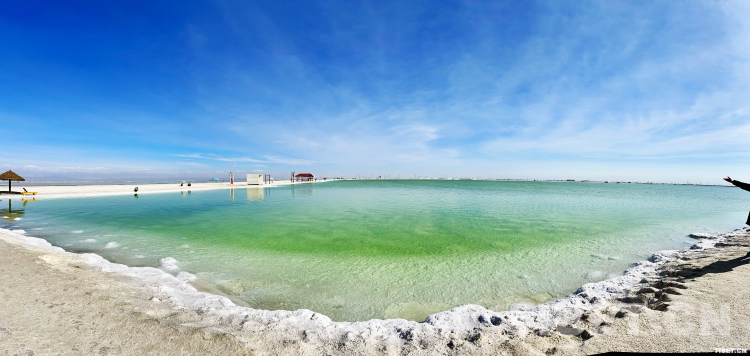 相較于茶卡鹽湖的玲瓏羞赧,作為“亞洲第一鹽湖、世界第二鹽湖”的察爾汗鹽湖便顯得格外浩蕩闊大起來(lái)——由達(dá)布遜湖以及南霍布遜、北霍布遜、澀聶等鹽池匯聚而成,總面積5856平方公里,格爾木河、柴達(dá)木河等多條內(nèi)流河注入該湖,有萬(wàn)丈鹽橋拔地而起,青藏鐵路穿湖而過(guò)。湖水呈碧綠色,湖面寬闊浩大,向地平線(xiàn)遠(yuǎn)遠(yuǎn)望去,只見(jiàn)綠浪如山,一望無(wú)際,在風(fēng)沙粗糲的茫茫戈壁宛如一塊流落人間的綠寶石。