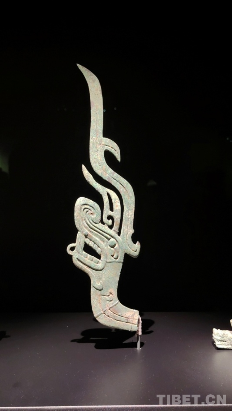 圖為三星堆二號(hào)祭祀坑出土青銅龍,頭頂玉璋,攝于三星堆博物館。距今約3000年