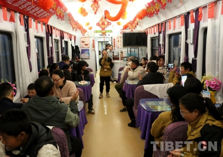 圖為晚餐時間,同學(xué)們和同車旅客、工作人員一起聯(lián)歡 攝影:王佳豪