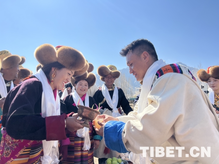 開耕儀式結(jié)束后,茶巴朗村藏戲隊(duì)成員們?yōu)樵缫褤Q好藏裝過(guò)來(lái)體驗(yàn)西藏民俗文化的游客們獻(xiàn)哈達(dá)、敬青稞酒、唱敬酒歌,游客們現(xiàn)場(chǎng)學(xué)起“三口一杯”與當(dāng)?shù)厝斯捕冗@美好的一天。西藏卓美旅行社負(fù)責(zé)人孫赫男介紹說(shuō):“西藏除了山水美景之外,春耕儀式也是非常具有當(dāng)?shù)靥厣奈幕?hào),能給人留下深刻記憶。今天,我?guī)е鴣?lái)自北上廣等全國(guó)各地的游客來(lái)這里體驗(yàn)春耕儀式,讓大家看看西藏當(dāng)?shù)氐娜罕娛窃鯓娱_始春天的。游客們穿著藏裝,免費(fèi)品嘗青稞酒、酥油茶、牛肉、藏雞蛋等各種農(nóng)產(chǎn)品,還和充滿熱情的當(dāng)?shù)卮迕駛兓?dòng),他們玩得非常開心?!?nbsp;