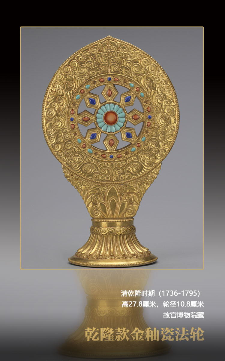 清代皇家崇奉藏傳佛教,乾隆登基后曾命內務府造辦處下屬的景德鎮(zhèn)御窯廠燒制各式瓷質佛像與法器備供奉之用。此款金釉瓷法輪仿自當時銅鎏金法輪,為乾隆朝所首創(chuàng),至嘉慶朝仍有制作,只是底款不同,型制并無區(qū)別。這種瓷質法輪不僅以金彩仿出銅鍍金效果,還以色彩鮮艷的釉色仿出綠松石、青金石、珊瑚等各種寶石,不得不贊嘆當時工藝的創(chuàng)新與突破。