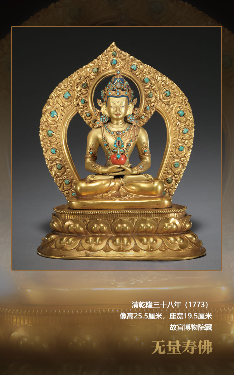 這尊造像與其他五十五尊同樣造型的無(wú)量壽佛,一同供奉在紫禁城養(yǎng)性殿西暖閣佛堂的一座八面七層的紫檀木佛塔中。根據(jù)《六世班禪洛桑巴丹益希傳》、內(nèi)務(wù)府造辦處《活計(jì)檔》及軍機(jī)處滿文檔案的記載,乾隆帝在乾隆三十五年(1770)寧壽宮區(qū)域營(yíng)建開始前,即乾隆三十三年(1768)向六世班禪訂做了這五十六尊無(wú)量壽佛,佛像圖樣、鑲嵌寶石等材料均為宮廷提供。這些造像于乾隆三十八年完成并送回宮廷,此后一直供奉于養(yǎng)性殿佛堂至今。乾隆四十五年(1780)六世班禪進(jìn)京朝覲,還曾親自瞻仰過(guò)此塔此像。故這組無(wú)量壽佛,是乾隆時(shí)期宮廷審美與扎什倫布寺造像技術(shù)的高度融合,經(jīng)過(guò)乾隆帝本人親自設(shè)計(jì),又有明確的制作時(shí)間,是清代宮廷造像及扎什倫布寺造像研究的重要標(biāo)型器物。