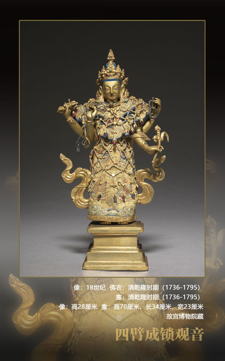 成鎖觀音,即不空羂索觀音。觀音一面四臂,分別持羂索、金剛杵、念珠、金剛鉤,在現(xiàn)在的圖像里很少找到持物相同的造像,可能是特別的傳承。觀音立姿站于方形臺(tái)座上。因其所著佛衣未曾打開,故造像身體裝飾情況不清。佛衣為清宮配做,繡工精細(xì),上綴串珠瓔珞,極具宮廷風(fēng)格。另有清宮配做紫檀木重檐亭式玻璃門佛龕,龕背面陰刻四體文題記,漢文為:“乾隆三十七年十二月十二日,欽命阿旺班珠爾胡土克圖認(rèn)看供奉大利益扎什璃瑪四背成鎖觀世音菩薩?!薄八谋场奔础八谋邸钡恼`書。