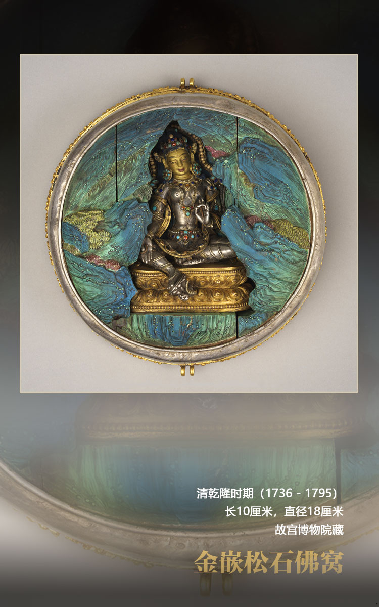 此佛窩九成金質(zhì),圓盒狀,金質(zhì)盒蓋上滿嵌梯形同心圓狀綠松石片,側(cè)面有三條松石鑲嵌的裝飾帶及蓮花紋圖案。盒蓋兩邊有可拆卸雙耳,可穿繩佩戴頸上,為護(hù)身佛盒。盒內(nèi)填染青綠木雕山洞,中間供有銀質(zhì)綠度母一尊。度母面部泥金,右手與愿印,左手說(shuō)法印,身上嵌綠松石、青金石、蜜蠟等,游戲坐于飾連珠紋和俯仰蓮瓣紋的金座上。附黃紙簽一張,上書漢、滿、蒙、藏四體文題記,漢文曰:“乾隆四十五年八月初七日,班禪額爾德尼恭祝皇上七旬萬(wàn)壽,遞丹書,呈進(jìn)大利益綠衣救度佛母古佛?!?此處“大利益”有大功德之意,根據(jù)銘文可知,這個(gè)佛窩應(yīng)是乾隆帝七十大壽時(shí)六世班禪敬獻(xiàn)的祝壽禮物。(文圖資料來(lái)源:澳門藝術(shù)博物館 中國(guó)西藏網(wǎng) 記者/易文文 趙佳 呂靜 王東 姚浩然)
