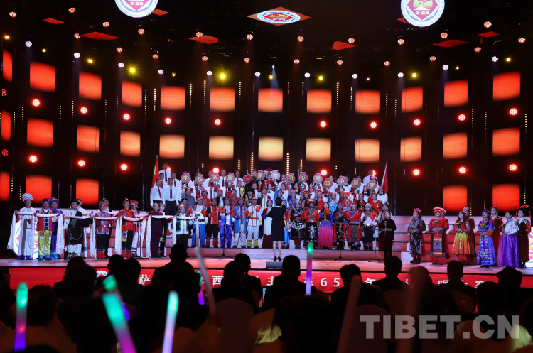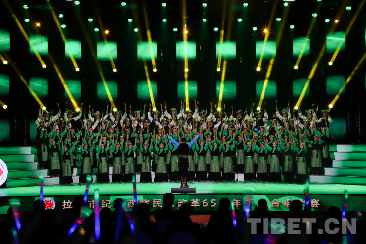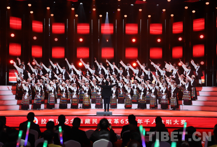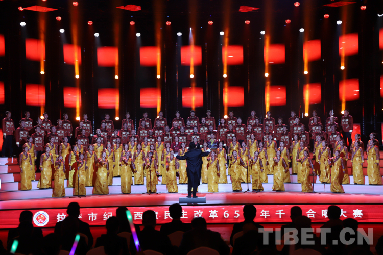中國西藏網訊 3月27日晚,《盛世中國 幸福西藏》拉薩市紀念西藏民主改革65周年千人合唱大賽在拉薩師范高等??茖W校體育館舉行。